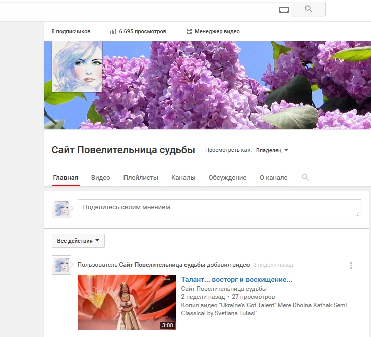 Лента Ютуб "Повелительница судьбы" - на ней можно сидеть часами и бесконечно слушать отборные музыкальные композиции. Это лента о любви, о гармонии, о личностном женском росте, о бесконечной чувственности...