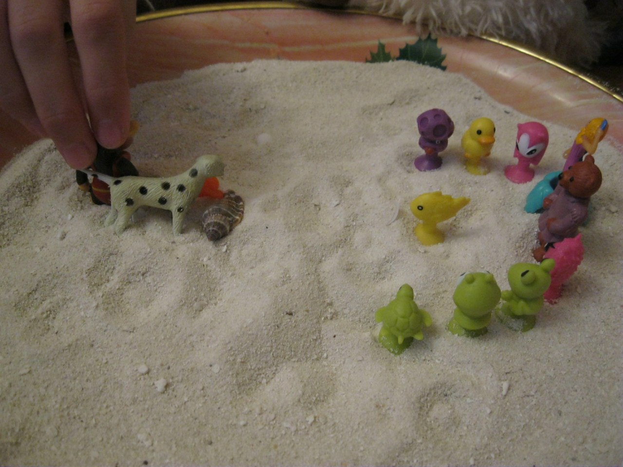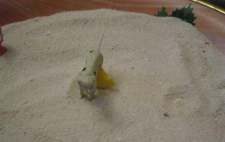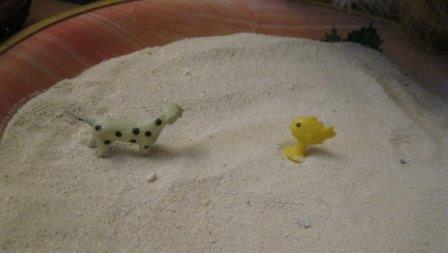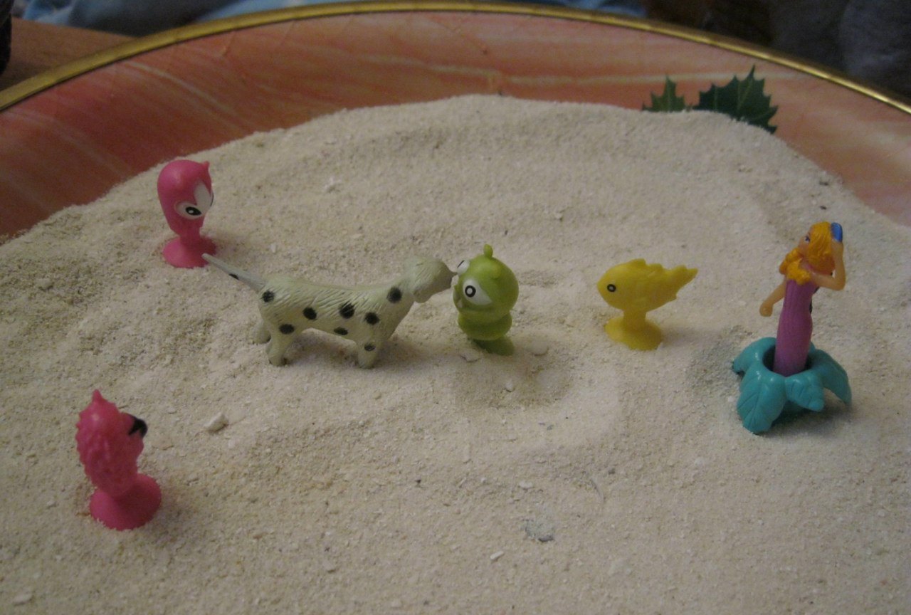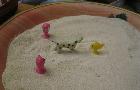Песок я набирала с труднодоступных мест, куда нога редкого верблюда добредет!:) И солнце естественным образом прокаляло его, если он со стороны океана... Если вы так же брезгливы, как и я, и песок из песочницы тоже неприемлем: пока негде взять, собачки пошкреблись и т.д., и в Египет с Мальдивами за песочным "инструментом" пока не собираетесь :), то можно использовать манку. В ясельном возрасте дочи я покупала, специально для игры, пару килограмм обыкновенной манки, и мы играли в плоском тазике, закапывая "секретики", наслаждаясь фактурой материала :).
