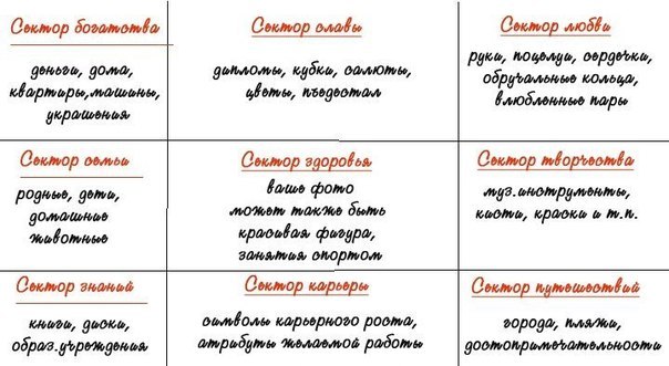 • С сеткой Багуа мы разобрались. Теперь поговорим о фотографиях для создания карты желаний. Их стоит подбирать не спеша, обращая внимание на ваши ощущения. Картинки должны быть позитивными, яркими, вызывающими эмоции радости и обладания желаемым.