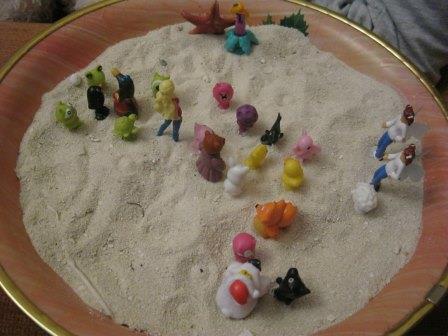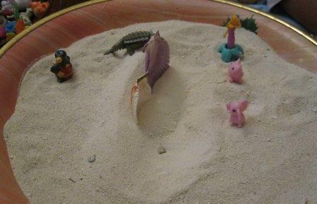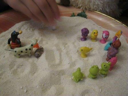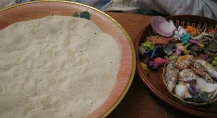 Песок я набирала с труднодоступных мест, куда нога редкого верблюда добредет!:) И солнце естественным образом прокаляло его, если он со стороны океана... Если вы так же брезгливы, как и я, и песок из песочницы тоже неприемлем: пока негде взять, собачки пошкреблись и т.д., и в Египет с Мальдивами за песочным "инструментом" пока не собираетесь :), то можно использовать манку. В ясельном возрасте дочи я покупала, специально для игры, пару килограмм обыкновенной манки, и мы играли в плоском тазике, закапывая "секретики", наслаждаясь фактурой материала :).