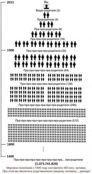Некоторые ученые феномен двойников называют «тайным родством». Если применить простой математический расчет, то любой человек через 8 поколений станет потомком 256 родственников, связанных кровным родством. А теперь подсчитайте, сколько наберется родственников через 30 поколений? Миллион! И ведь все эти родственные связи формируются на основе передачи генетического материала.