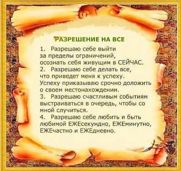 «Позволяю!» и «Отменяю!». Поэкспериментируйте с этими словами, попробуйте устранять проблемы и притягивать счастливые события.
